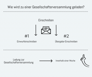 Grundsätzlich eine Alternative zu dem Einschreiben ist immer die Möglichkeit der Zustellung der Ladung zur Gesellschafterversammlung durch einen Gerichtsvollzieher.